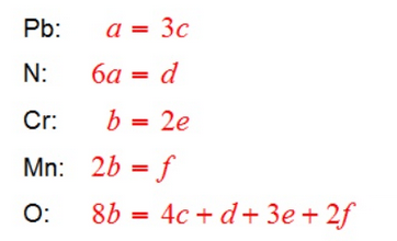 Y plantea el sistema de ecuaciones correspondiente (una ecuación por cada elemento químico). Por ejemplo, teniendo en cuenta que entran como reactivos a átomos de Pb y salen c entiades Pb3 y, como para todo elemento debe entrar la misma cantidad de átomos que sale, debería cumplirse esta igualdad para el Pb:
