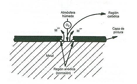 Lo que sucede es que el metal que ha quedado sin pintura, presenta un mejor acceso del oxígeno que el recubierto, en la región próxima al levantamiento y por ello es la zona fuente de electrones. Así, se corroe el metal de las zonas inmediatas situadas bajo la capa de pintura, donde se generan productos de corrosión, lo que produce una lesión en la capa de pintura e induce a una propagación de la zona sometida a corrosión.